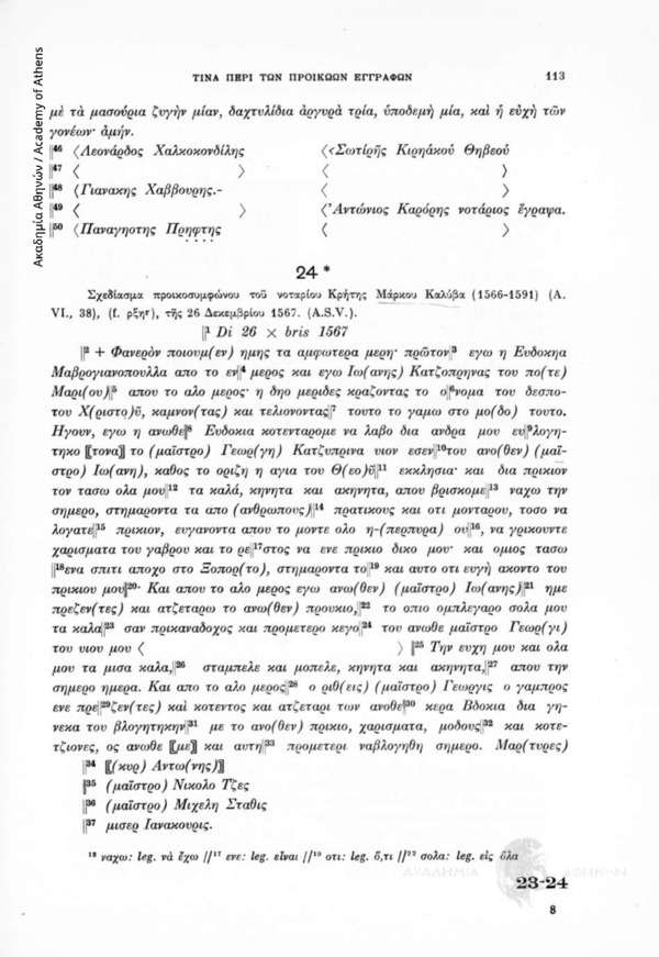 Σχεδίασμα προικοσυμφώνου τοῦ νοταρίου Κρήτης Μάρκου Καλύβα (1566-1591) (A. VI., 38), (f. ρξηr), τῆς 26 Δεκεμβρίου 1567. (A.S.V.), αριθ. εγγράφου 24 Είδος οντότητας Ψηφιακό τεκμήριο