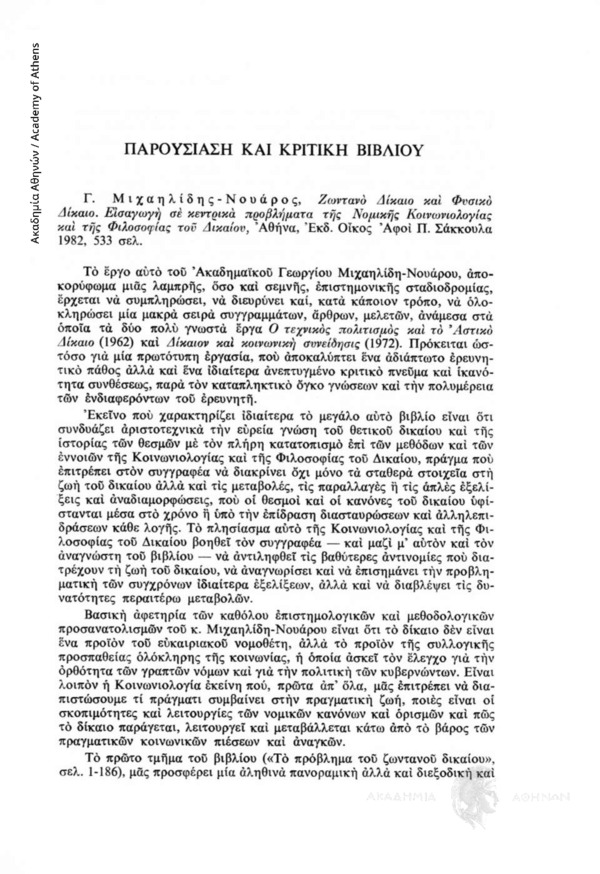 Γ. Μιχαηλίδης-Νουάρος, Ζωντανό Δίκαιο και φυσικό Δίκαιο. Εισαγωγή σε κεντρικά προβλήματα της Νομικής Κοινωνιολογίας και της Φιλοσοφίας του Δικαίου, Αθήνα, Εκδ. Οίκος Αφοί Π. Σάκκουλα, 1982, 533 σελ.