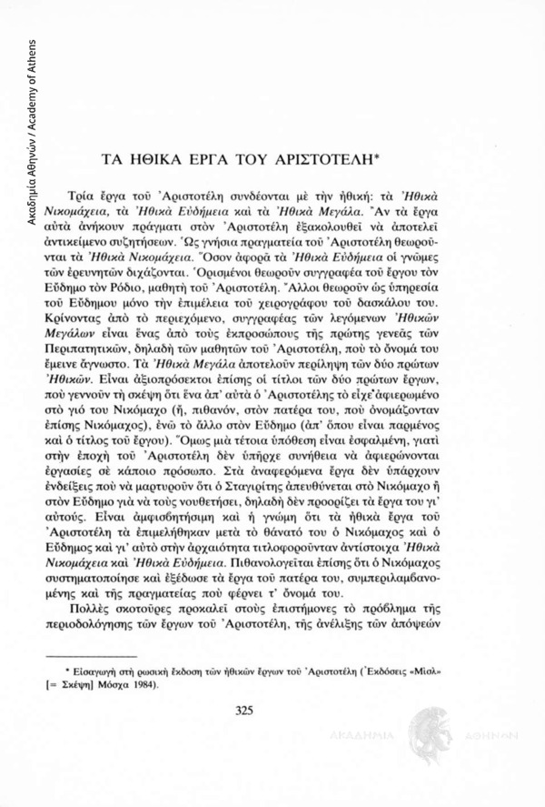 In der Fortsetzung skizziert der V. den Inhalt der Nikomachischen Ethik und hebt hervor, daß das Hauptthema dieser Schrift der Begriff der Eudaimonie ist, wie auch die Art und Weise ihrer Verwirklichung, die in der Vervollkommnung bzw. Selbstverwirklichung das Menschen besteht, der Begriff und die Einteilung der Tugend, die Tugend als die hauptvoraussetzung der Eudaimonie, die Unterscheidung der Tugend in ethische und dianoetische, der Begriff der ethischen Mitte, das Verhältnis zwischen der ethischen Tugend und der sittlichen Einsicht, die Hervorhebung des willentlichen Charakters der Tugend im Unterschied zu ihrer sokratischen Auffassung, der teleologische Charakter der Ethik, der individuelle und soziale Charakter der Ethik, das Problem der Beziehung zwischen Ethik und Politik, usw.