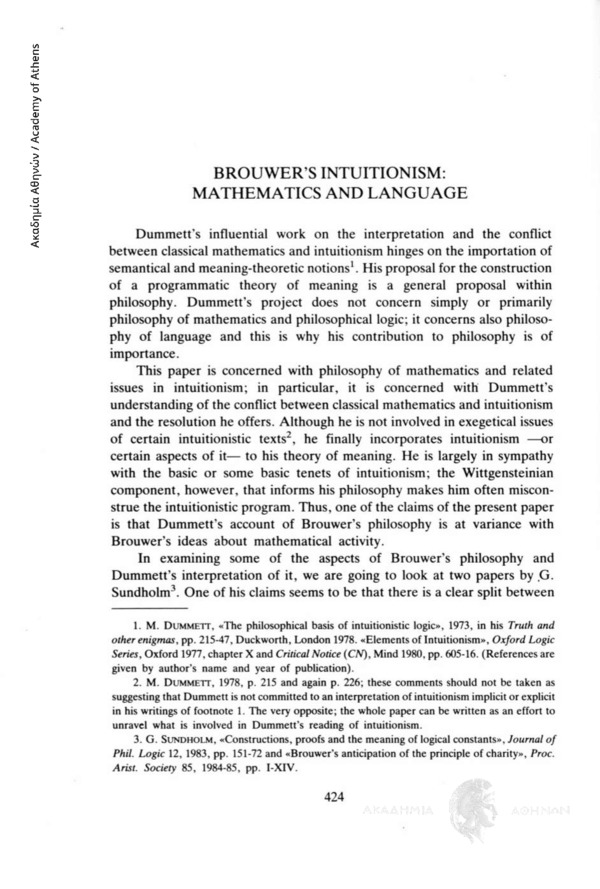 Ένα από τα βασικά δόγματα της φιλοσοφίας του Iντουϊσιονισμού (Intuitionism) του Brouwer είναι ο κατά βάση άγλωσσος χαρακτήρας της μαθηματικής δραστηριότητας. Η αμφισβήτηση της αυτονομίας της μαθηματικής δραστηριότητας και πρακτικής είναι εμφανής στην περίπτωση της ερμηνείας του ιντουϊσιονισμού από τον Μ. Dummett. Γι΄ αυτόν είναι δυνατή η κατασκευή μιας σημασιολογικής θεωρίας και μιας θεωρίας του νοήματος με τη βοήθεια της έννοιας της απόδειξης. Μπορούμε λοιπόν να θεμελιώσουμε, contra Dummett το δόγμα του Brouwer για τον άγλωσσο χαρακτήρα της μαθηματικής δραστηριότητας; Με ποιά έννοια πρέπει να κατανοηθεί μια τόσο προκλητική θέση;