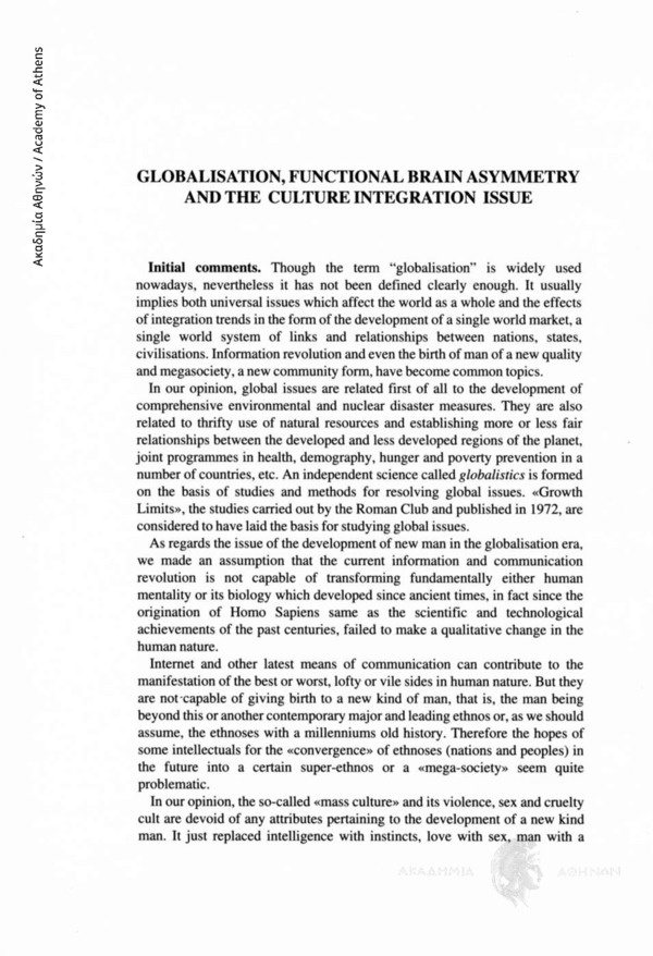 Globalisation, Functional, Brain Asymmetry and the Culture Integration Issue - Identifier: 174369