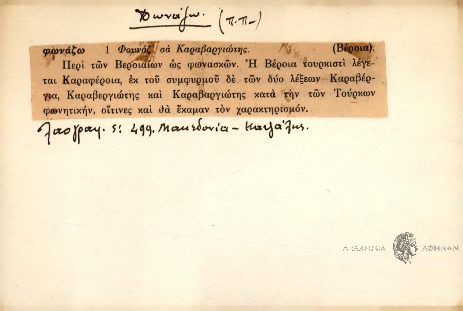 Περί των Βεροιαίων ως φωνασκούν. Η Βέροια τουρκιστί λέγεται Καραφέροια, εκ του συμφυρμού δε των δύο λέξεων Καραβέργια, Καραβεργιώτης και Καραβαργιώτης κατά τημ των Τούρκων φωνητικήν, οίτινες και θα έκαμαν τον χαρακτηρισμόν.