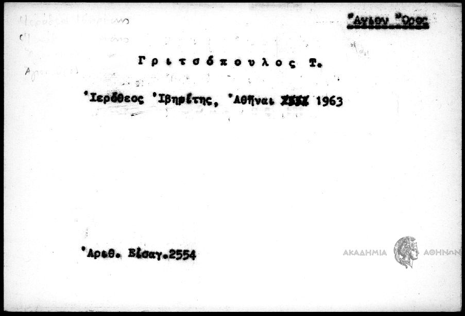 - Γριτσόπουλος Τ. Ιερόθεος Ιβηρίτης, Αθήναι 1963 Αριθ. Εισαγ. 2554