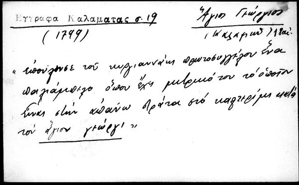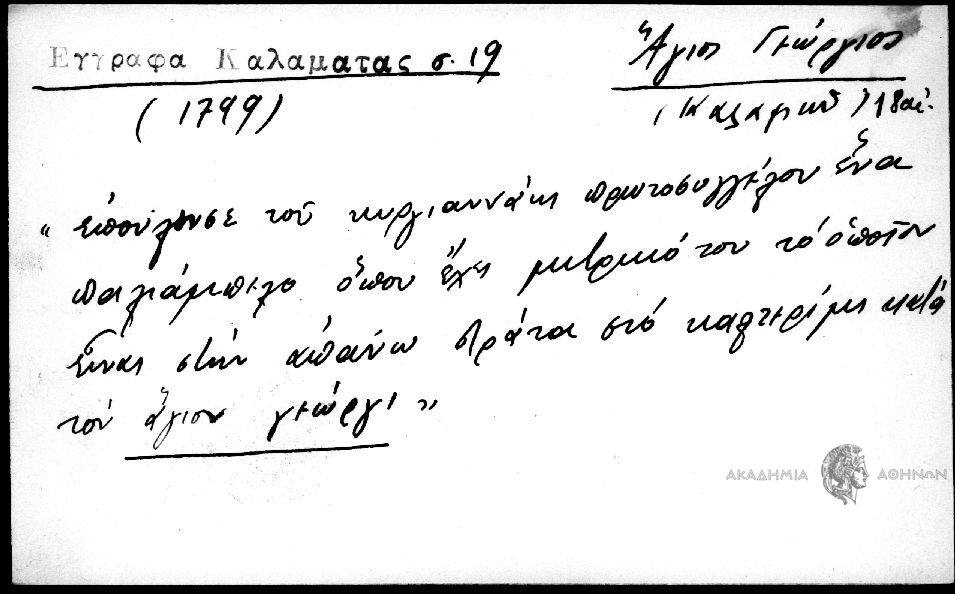 - "Επουλούσε του κυργιαννάκη πρωτοσυγγέλου ένα παλιάμπελο όπου έχει μιτρικό του το οποίον είναι στην απάνω στράτα στο καλτερίμι κατά τον άγιον γεώργι"