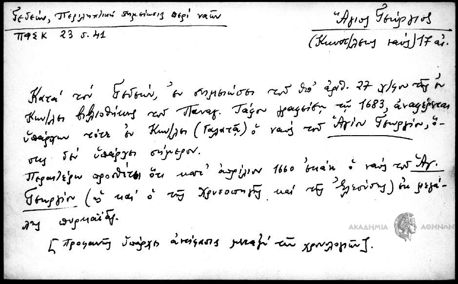 Κατά τον Γεδεών, εν σημειώσει του υπ΄αριθ. 27 χ/φου της εν Κων/λει βιβλιοθήκης του Παναγ. Τάφου γραφείση τω 1683, αναφέρεται υπάρχων τότε εν Κων/λει (Γαλατά) ο ναός του Αγίου Γεωργίου. όστις δεν υπάρχει σήμερον. Περαιτέρω προσθέτει ότι κατ΄απρίλιον 1660 εκάη ο ναός του Αγ. Γεωργίου (ως και ο της Χρυσοπηγής και της Ελεούσης) εκ μεγάλης πυρκαϊάς.