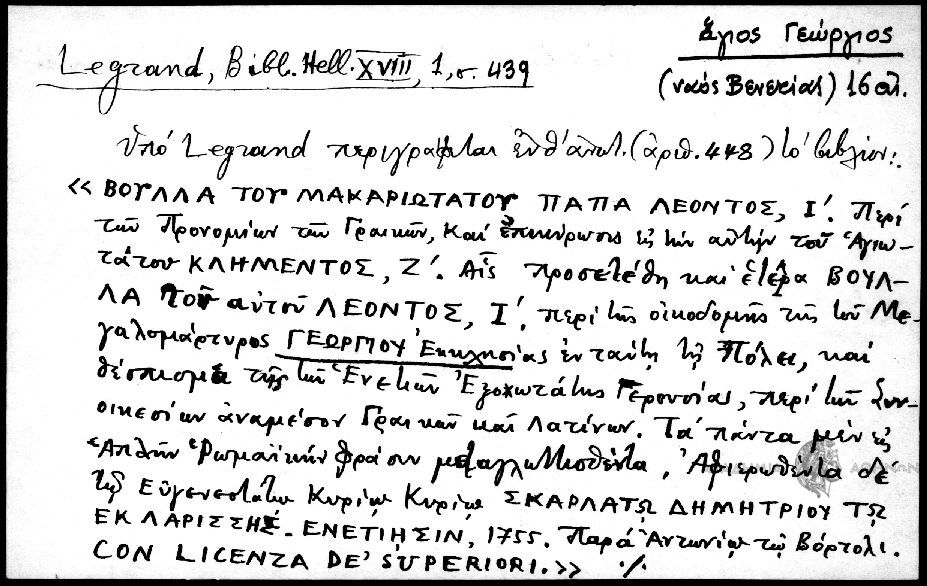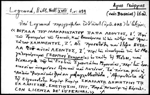 - Υπό Legrand περιγράφεται ένθ΄ ανωτ. (αριθ. 448) το βιβλίον: "ΒΟΥΛΛΑ ΤΟΥ ΜΑΚΑΡΙΩΤΑΤΟΥ ΠΑΠΑ ΛΕΟΝΤΟΣ Ι΄. Περί των Προνομίων των Γραικών και επικύρωσις εις την αυτή του Αγιωτάτου ΚΛΗΜΕΝΤΟΣ Ζ΄ . Αις προσετέθη και ετέρα ΒΟΥΛΛΑ του αυτού ΛΕΟΝΤΟΣ Ι΄ περί της οικοδομής της του Μεγαλομάρτυρος ΓΕΩΡΓΙΟΥ Εκκλησίας εν ταύτη τη Πόλει, και θέσπισμα της των Ενετών Εξοχωτάτης Γερουσίας, περί των Συνοικεσίων αναμέσον Γραικών και Λατίνων. Τα πάντα μεν εις Απλήν Ρωμαϊκήν φράσιν μεταγλωττισθέντα. Αφιερωθέντα δε τω Ευγενεστάτω Κυρίω Κυρίω ΣΚΑΡΛΑΤΩ ΔΗΜΗΤΡΙΟΥ ΤΩ ΕΚ ΛΑΡΙΣΣΗΣ, ΕΝΕΤΙΗΣΙΝ 1755. Παρά Αντωνίω τω Βόρτολι. CON LICENZA DE΄ SUPERIORI." Το βιβλίον είναι σχήματος 4ου εκ 2 φύλλων άνευ αριθμήσεως και 32 σελίδων.