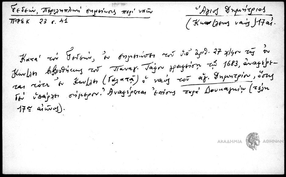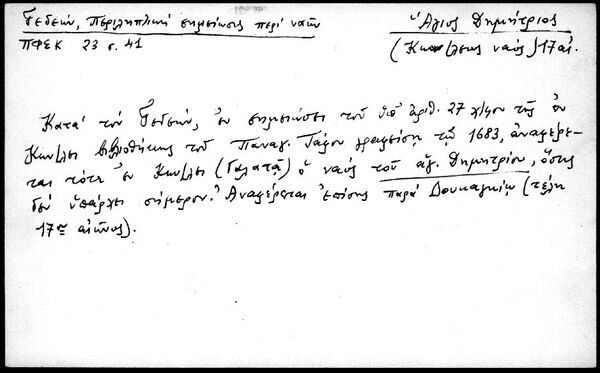 - Κατά τον Γεδεών, εν σημειώσει του υπ΄ αριθ. 27 χ/φου της εν Κων/λει βιβλιοθήκης του Παναγ. Τάφου γραφείση τω 1683, αναφέρεται τότε εν Κων/λει (Γαλατά) ο ναός του αγ. Δημητρίου, όστις δεν υπάρχει σήμερον. Αναφέρεται επίσης παρά Δουκαγκίω (τέλη 17ου αιώνος).