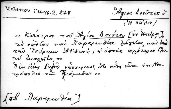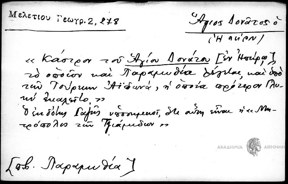- "Κάστρον του Αγίου Δονάτου [εν Ηπείρω] το οποίον και Παραμυθία λέγεται, και υπό των Τούρκων Αϊδωνά, η οποία πρότερον Γλυκύ εκαλείτο" Ο εκδότης Γαζής υποσημειοί, ότι αύτη είναι η "Μητρόπολις των Τζιαμήδων" πβ. Παραμυθία