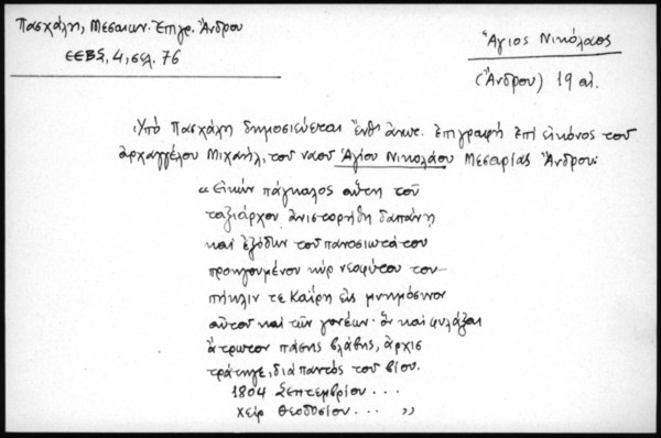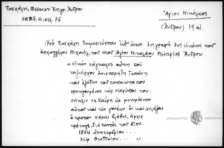 - Υπό Πασχάλη δημοσιεύεται ένθ΄ ανωτ. επιγραφή επί εικόνος του αρχαγγέλου Μιχαήλ, του ναού Αγίου Νικολάου Μεσαρίας Άνδρου: "Εικών πάγκαλος αύτη του ταξιάρχου ανιστορήθη δαπάνη και εξόδων του πανοσιωτάτου προηγουμένου κυρ νεοφύτου του πήκλιν τε Καΐρη εις μνημόσυνον αυτού και των γονέων. ον και φυλάξαι άτρωτον πάσης βλάβης, άρχισ τράτηγε, διά παντός του βίου. 1804 Σεπτεμβρίου... χειρ Θεοδοσίου..."