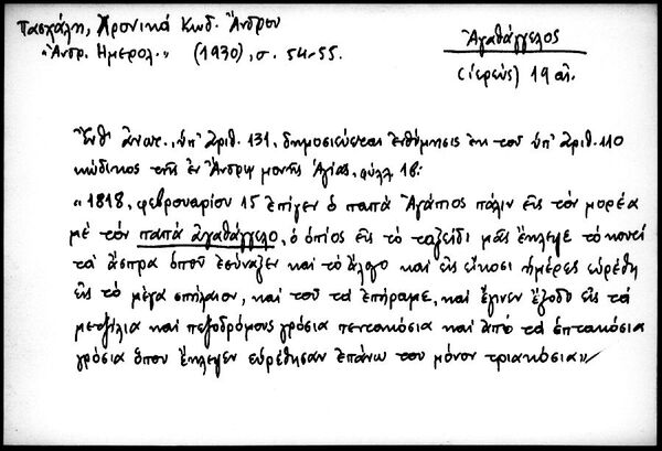 - Ένθ΄ανώτ. υπ΄αριθ. 131 δημοσιεύεται ενθύμησις εκ τού υπ΄αριθ. 110 κώδικος τής εν Άνδρω μονής Αγίας, φύλλ. 1β: "1818 φεβρουαρίου 15 επίγεν ο παπά Αγάπιος πάλιν εις τόν μορέα μέ τόν παπά αγαθάγγελο, ο οπίος εις τό ταξείδι μάς έκλεψε τό κουτί τά άσπρα οπού εσύναξεν καί τό άλογο καί εις είκοσι ημέρες ευρέθη εις τό μέγα σπήλαιον, καί τού τα επήραμε, καί έγινεν έξοδο εις τά μετζίλια καί πεζοδρόμους γρόσια πεντακόσια καί από τά επτακόσια γρόσια όπου έκλεψεν ευρέθησαν επάνω του μόνον τριακόσια".