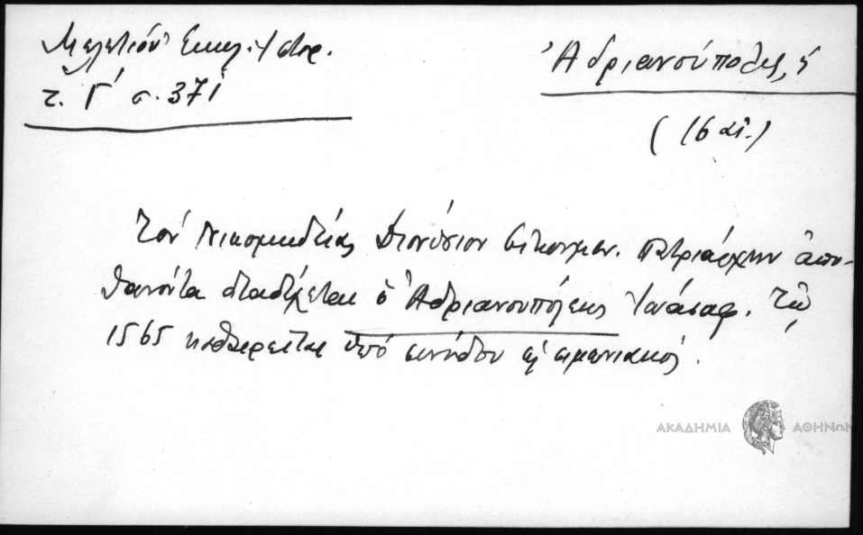 - Τον Νικομηδείας Διονυσίου Οικουμ. Πατριάρχην αποθανόντα διαδέχεται ο Αδριανουπόλεως Ιωάσαφ. Τω 1565 καθαίρεται υπό συνόδου ως σιμωνιακός.