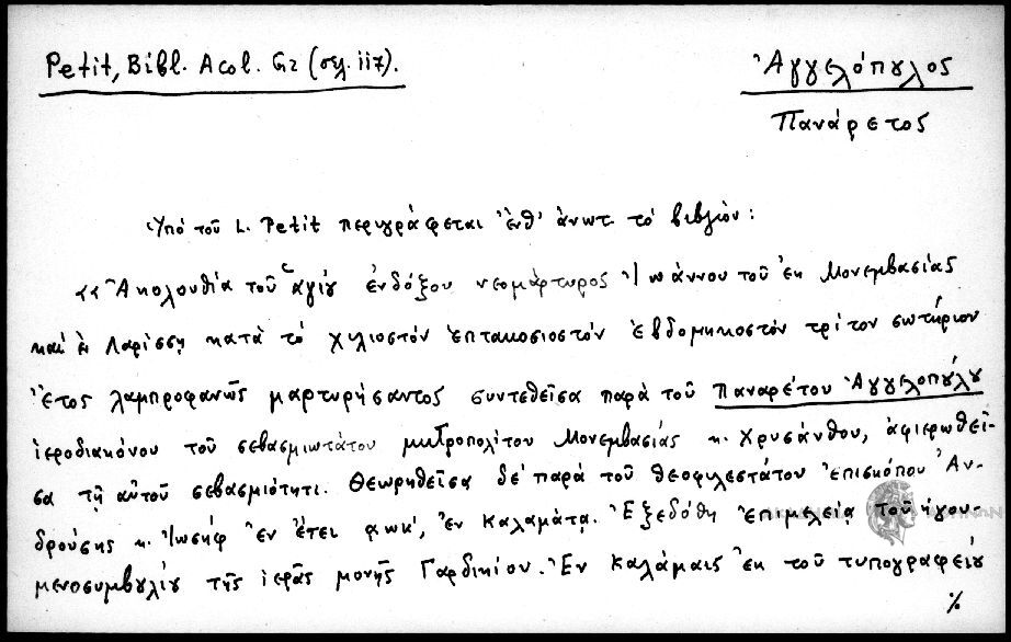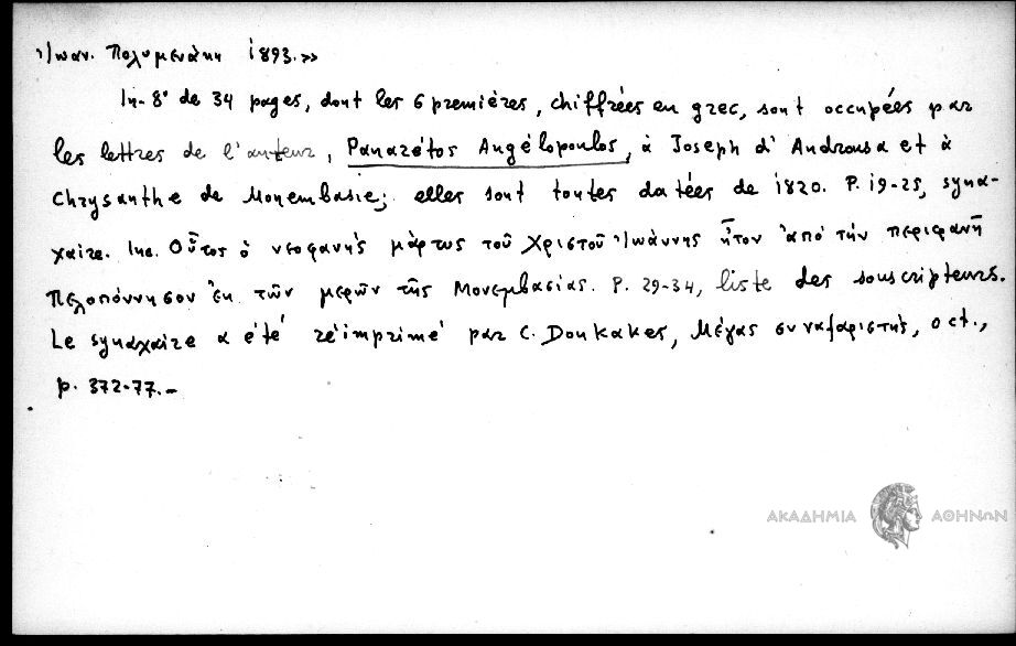 - Υπό τού L. Petit περιγράφεται ένθ΄ανωτ. τό βιβλίον: "Ακολουθία τού αγίου ενδόξου νεομάρτυρος Ιωάννου τού εκ Μονεμβασίας καί εν Λαρίσση κατά τό χιλιοστόν επτακοσιοστόν εβδομηκοστόν τρίτον σωτήριον έτος λαμπροφανώς μαρτυρήσαντος συντεθείσα παρά τού Πανάρετου Αγγελόπούλου ιεροδιακόνου τού σεβασμιοτάτου μητροπολίτου Μονεμβασίας κ. Χρυσάνθου, αφιερωθείσα τη αυτού σεβασμιότητι. Θεωρηθείσα δέ παρά τού θεοφιλεστάτου επισκόπου Ανδρούσης κ. Ιωσήφ εν έτει αωκ, εν Καλαμάτα. Εξεδόθη επιμελεία τού ηγουμενοσυμβουλίου τής ιεράς μονής Γαρδικίου. Εν Καλαμαίς εκ τού τυπογραφείου / Ιωάν. Πολυμενάκη 1893". In. 8 de 34 pages, dont les 6 premieres, chiffrees en grec, sont occupees par les lettres de l΄auteur, Panaretos Angelopoulos, a Joseph d΄Androusa et a Chrysanthe de Monembasie; elles sont toutes datees de 1820. p. 19-25, synaxaire. Ins. Ούτος ο νεοφανής μάρτυς τού Xριστού Ιωάννης ήτον από τήν περιφανή Πελοπόννησον εκ τών μερών τής Μονεμβσίας p. 29-34, liste de souscripteurs . Le synaxaire a ete reimprime par C. Doukakes, Μέγας συναξαριστής, oct., p. 372-377.