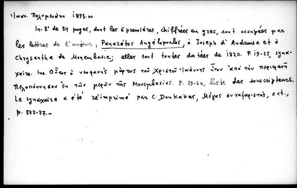 Γεγονός: Έκδοση του έργου του Πανάρετου Αγγελόπουλου: "Ακολουθία τού αγίου ενδόξου νεομάρτυρος Ιωάννου τού εκ Μονεμβασίας καί εν Λαρίσση κατά τό χιλιοστόν επτακοσιοστόν εβδομηκοστόν τρίτον σωτήριον έτος λαμπροφανώς μαρτυρήσαντος συντεθείσα παρά τού Πανάρετου Αγγελόπούλου ιεροδιακόνου τού σεβασμιοτάτου μητροπολίτου Μονεμβασίας κ. Χρυσάνθου, αφιερωθείσα τη αυτού σεβασμιότητι. Θεωρηθείσα δέ παρά τού θεοφιλεστάτου επισκόπου Ανδρούσης κ. Ιωσήφ εν έτει αωκ, εν Καλαμάτα. Εξεδόθη επιμελεία τού ηγουμενοσυμβουλίου τής ιεράς μονής Γαρδικίου. Εν Καλαμαίς εκ τού τυπογραφείου / Ιωάν. Πολυμενάκη 1893".
