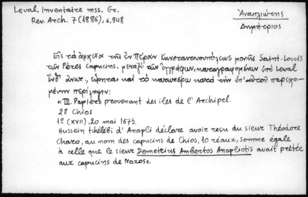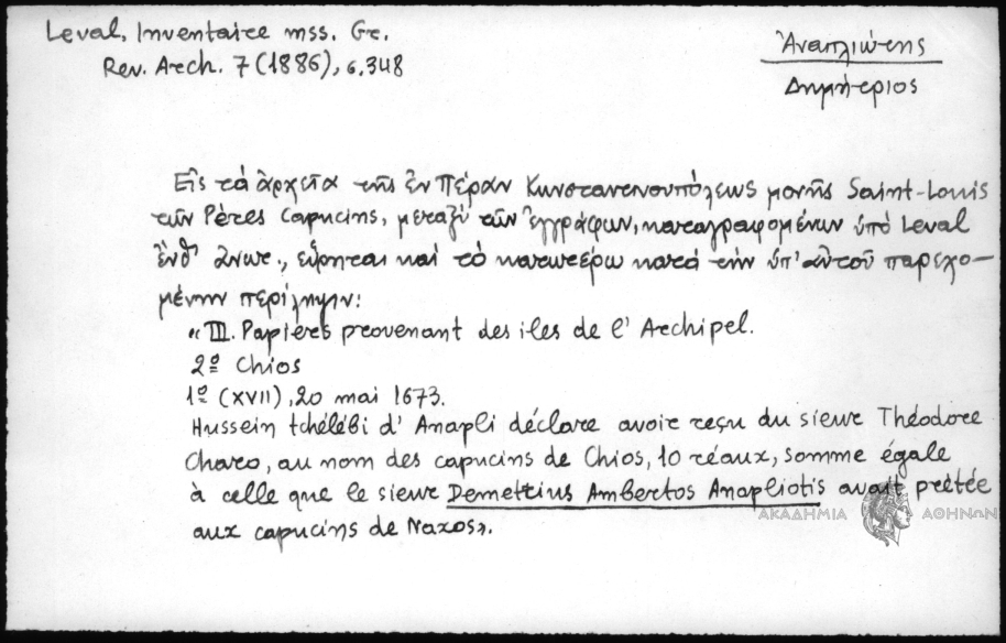 - Εις τα αρχεία της εν Πέραν Κωνσταντινουπόλεως μονής Saint-Louis των Peres Capucins, μεταξύ των εγγράφων, καταγραφομένων υπό Leval ένθ΄ανωτ., εύρηται και το κατωτέρω κατά την υπ΄αυτού παρεχομένην περίληψιν: "III. Papiers provenant des iles de l΄Archipel. 2o Chios 1o (XVII), 20 mai 1673. Hussein tchelebi d΄Anapli declare avoir recu du sieur Theodore Charo, au nom des capucins de Chios, 10 reaux, somme egale a celle que le sieur Demetrius Ambertos Anapliotis avait pretee aux capucins de Naxos".