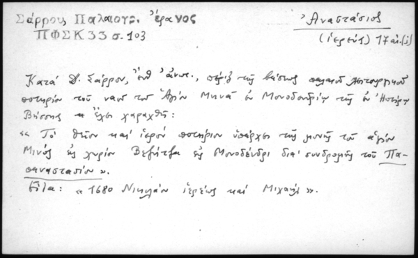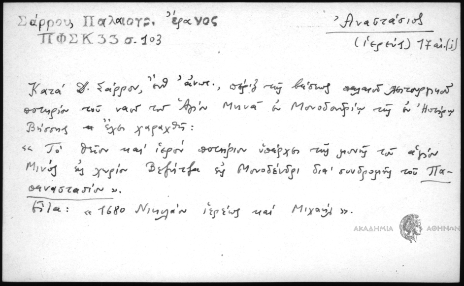 Αναφορά του ιερέα Αναστασίου σε επιγραφή λειτουργικού ποτηριού στον ναό του Αγίου Μηνά στο χωριό Μονοδένδρι.