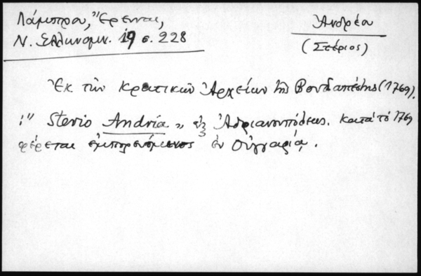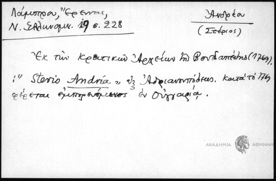 - Εκ των Κρατικών Αρχείων της Βουδαπέστης (1769): "Sterio Andria" εξ Αδριανουπόλεως. Κατά το 1769 φέρεται εμπορευόμενος εν Ουγγαρία.
