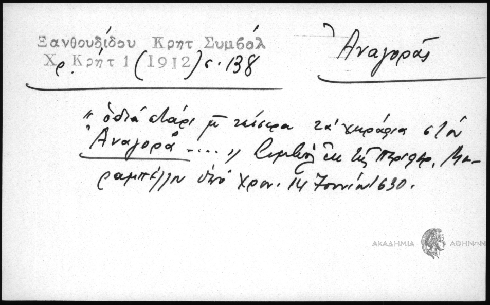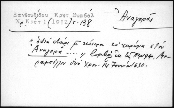 - "οδία στάρι μ τέσσερα τα χωράφια στον Αναγορά...". Συμβόλ. εκ της περιφερ. Μεραμπέλλου υπό χρον. 14 Ιουνίου 1630