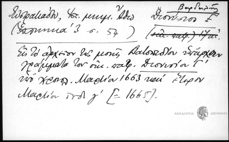 Γεγονός: Επιστολή του οικουμενικού πατριάρχη Διονυσίου Γ΄που σώζεται στη Μονή Βατοπεδίου.