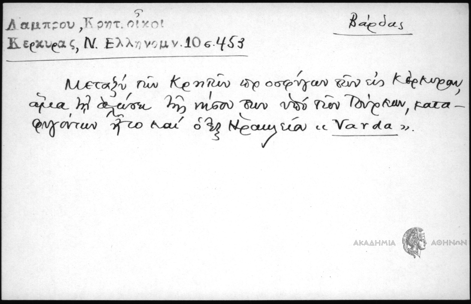 - Μεταξύ των Κρητών προσφύγων των εις Κέρκυραν, άμα τη αλώσει της νήσου των υπό των Τούρκων, καταφυγόντων ήτο και ο εξ Ηρακλείου "Varda".