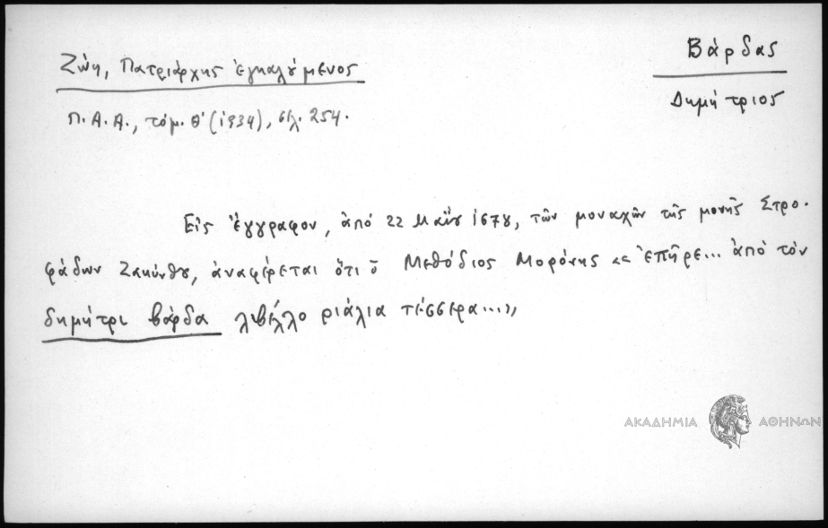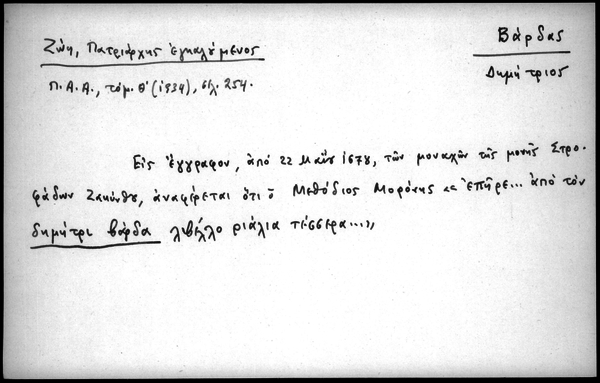- Εις έγγραφον, από 22 Μαΐου 1678, των μοναχών της μονής Στροφάδων Ζακύνθου, αναφέρεται ότι ο Μεθόδιος Μορόνης "επήρε... από τον δημήτρι βάρδα λιβέλλο ριάλια τέσσερα..."