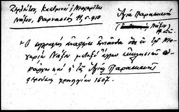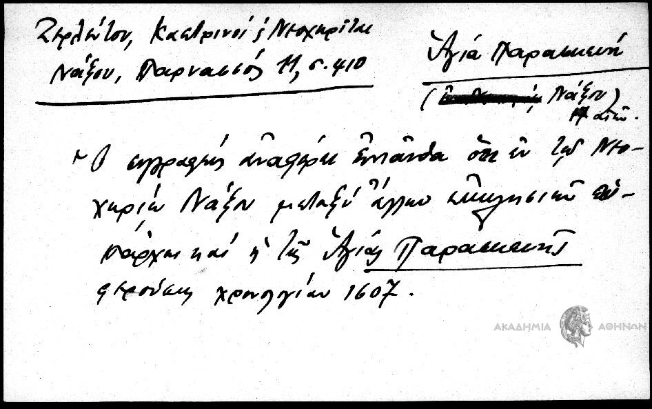 - Ο συγγραφεύς αναφέρει ενταύθα ότι εν τώ Νεοχωρίω Νάξου μεταξύ άλλων εκκλησιών ενυπάρχει καί η τής Αγίας Παρασκευής φερούσης χρονολογίαν 1607