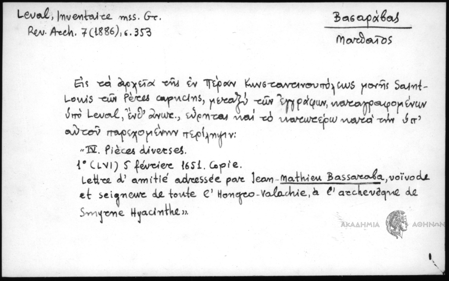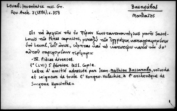- Εις τα αρχεία της εν Πέραν Κωνσταντινουπόλεως μονής Saint-Louis των Peres capucins, μεταξύ των εγγράφων, καταγραφομένων υπό Leval, ένθ. ανωτ., εύρηται και το κατωτέρω κατά την υπ. αυτού παρεχομένην περίληψην: IV. Pieces diverses. 1o (LVI) 5 fevrier 1651 Copie Lettre d' amitie adressee par Jean-Mathieu Bassaraba, voivode et seigneur de toute l' Hongro-Valachie, a l' archeveque de Smyrne Hyacinthe".