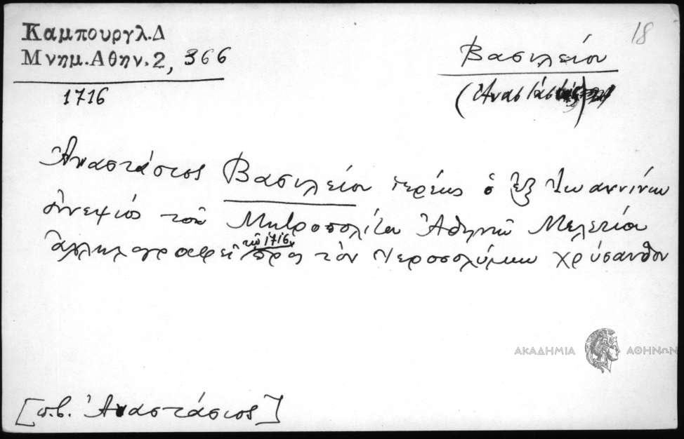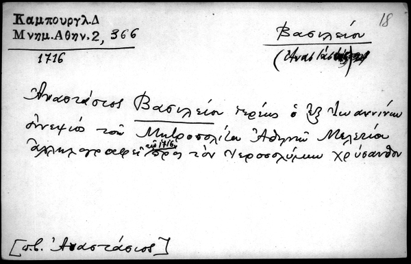 - Αναστάσιος Βασιλείου ιερεύς ο εξ Ιωαννίνων ανεψιός του Μητροπολίτου Αθηνών Μελετίου αλληλογραφεί τω 1716 προς τον Ιεροσολύμων Χρύσανθο. [πβ. Αναστάσιος]