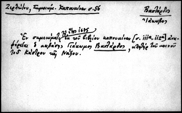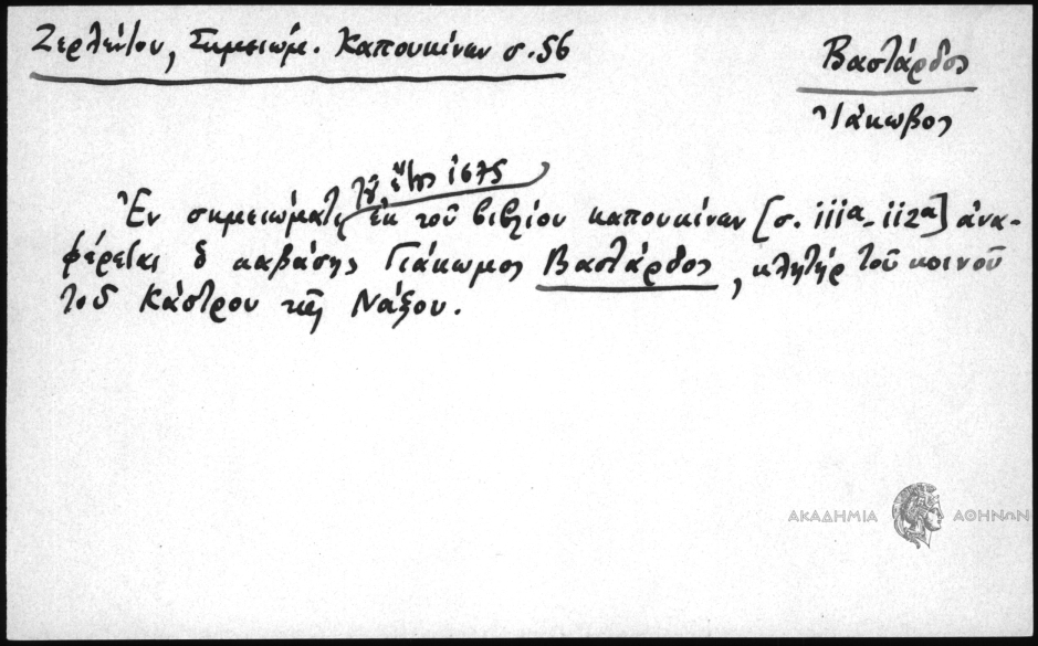 - Εν σημειώματι του έτους 1675 εκ του βιβλίου καπουκίνων [σ. 111α-112α] αναφέρεται ο καβάσης Γιάκωμος Βαστάρδος, κλητήρ του κοινού του Κάστρου της Νάξου.