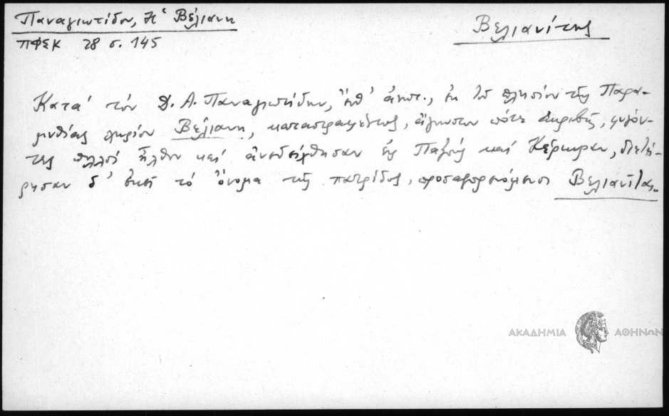 - Κατά τον Δ. Α. Παναγιωτίδην, ένθ. ανωτ., εκ του πλησίον της Παραμυθίας χωρίον Βέλιανη, καταστραφέντος, άγωνστον πότε ακριβώς, φυγόντες πολλοί ήλθον και ανεδείχθησαν εις Παξούς και Κέρκυραν, διετήρησαν δ΄εκεί το όνομα της πατρίδος, προσαγορευόμενοι Βελιανίται.