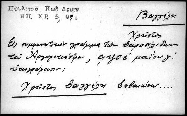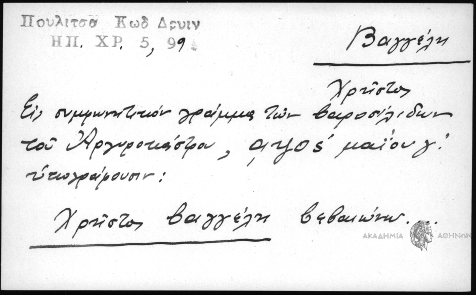- Εις συμφωνητικόν γράμμα των βαροσίλιδων του Αργυροκάστρου, αψος μαΐου γ΄ υπογράφουν: Χρήστος Βαγγέλη βεβαιώνω...