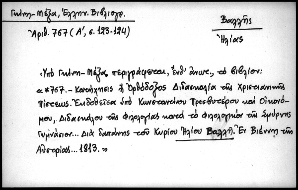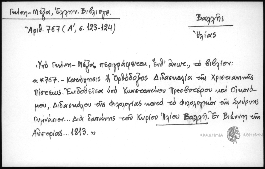 - Υπό Γκίνη - Μέξα περιγράφεται, ένθ΄ ανωτ., το βιβλίον: "*767 - Κατήχησις ή Ορθόδοξος Διδασκαλία της Χριστιανικής Πίστεως. Εκδοθείσα υπό Κωνσταντίνου Πρεσβυτέρου και Οικονόμου, Διδασκάλου της Φιλολογίας κατά το φιλολογικόν της Σμύρνης Γυμνάσιον... Δια δαπάνης του Κυρίου Ηλίου Βαλλή. Εν Βιέννη της Αυστρίας... 1813".