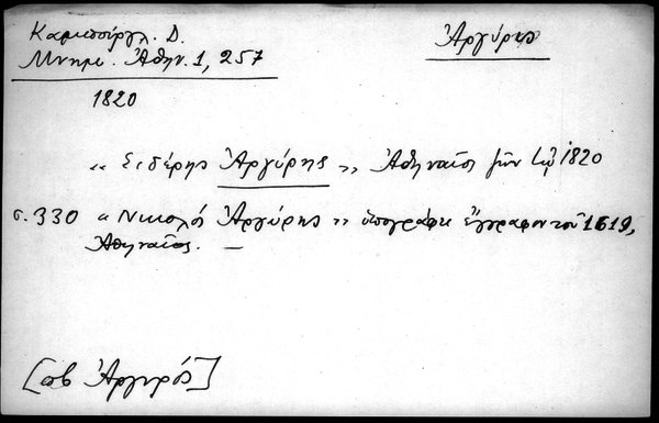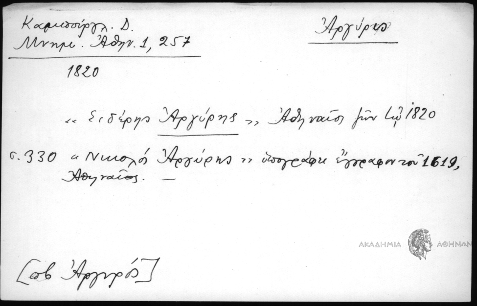 - "Σιδέρης Αργύρης" Αθηναίος ζων τω 1820. σ. 330 "Νικολός Αργύρης" υπογράφει έγγραφον του 1619, Αθηναίος. [Π.β. Αργυρός]