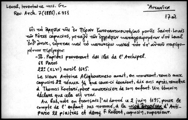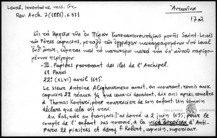 - Εις τά αρχεία τής εν Πέραν Κωνσταντινουπόλεως μονής Saint-Louis των Peres capucins, μεταξύ τών εγγράφων καταγραφομένων υπό Leval ένθ΄ανωτ. εύρηται και τό κατωτέρω κατά την υπ΄αυτού παρεχομένην περίληψην: "III Papiers provenant des iles de l΄Archipel. 6o Paros 22o (XLVI) avril 1695. Le sieur Antoine Alighourneso avait, en mourant, remis aux capucins 22 reaux 1/2 que ceux-ci devaient, dix ans apres, remettre a Thomas Kontari, pere nourricier de son enfant. Un temoin declare que cela est vrai. Au bas, note en francais: J΄ai donne ce 2 juin 1695, pour le compte de l΄enfant sus nomme, a la κερά αντονίνα d΄Antiparo 22 piastres et demy F. Robert, capucin, superieur.