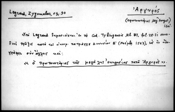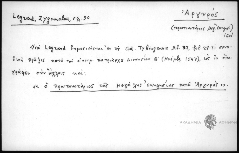 - Υπό Legrand δημοσιεύεται εκ του Cod. Tybingensis Mb. 37, fol. 28-31 συνοδική πράξις κατά του οικουμ. πατριάρχου Διονυσίου Β΄(Νοεμβρ. 1547), εις ην υπογράφει συν άλλοις και: "ο πρωτονοτάριος της μεγάλης εκκλησίας παπά Αργυρός".
