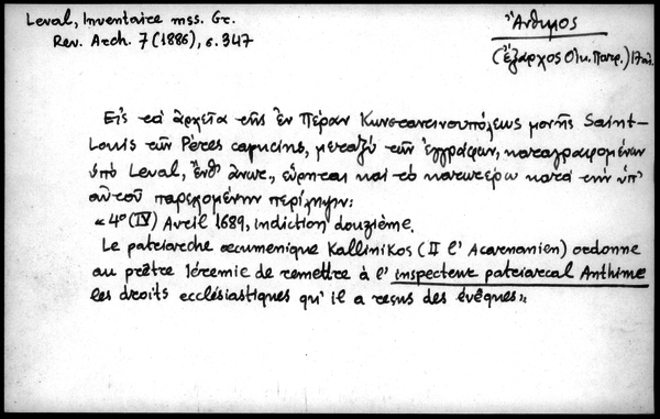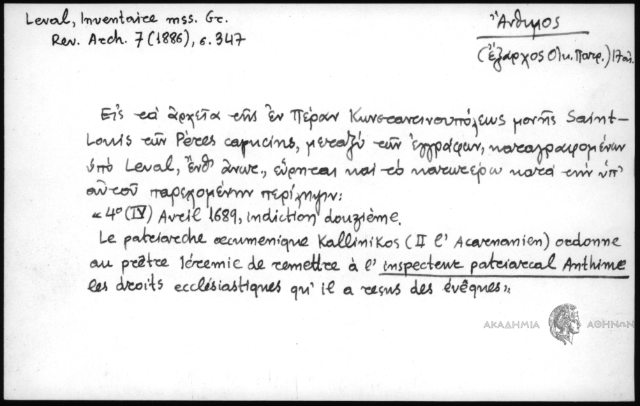 - Εις τα αρχεία της εν Πέραν Κωνσταντινουπόλεως μονής Saint Louis των Peres capucins, μεταξύ των εγγράφων, καταγραφομένων υπό Leval, ένθ΄ανωτ., εύρηται και το κατωτέρω κατά την υπ΄αυτού παρεχομένην περίληψιν: "4ο (IV) Avril 1689, indiction douzieme. Le patriarche oecumenique Kallinikos (II l΄Acarnanien) ordonne au pretre Ieremie de remettre a l΄inspecteur patriarcal Anthime les droits ecclesiastiques qu΄il a recus des eveques".