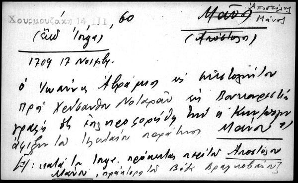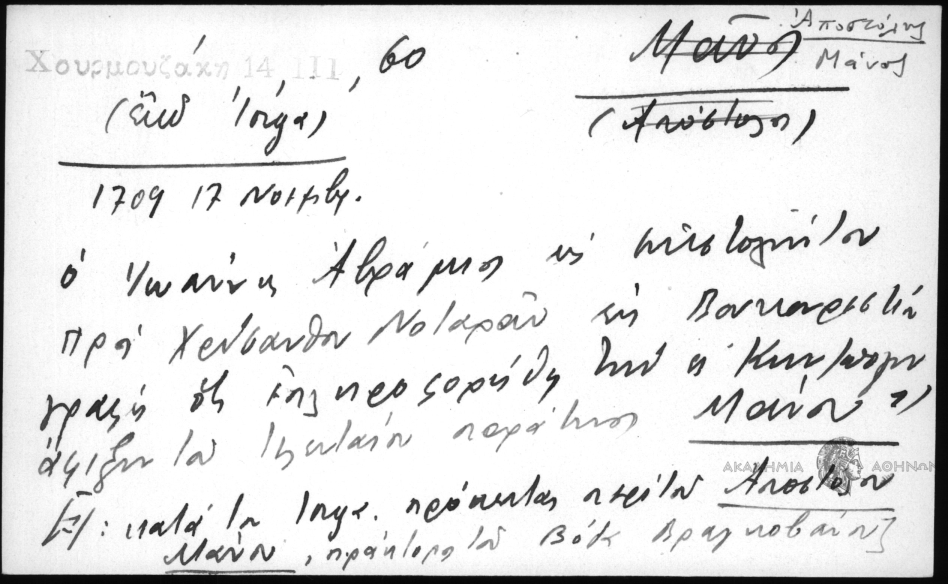 - 1709 19 Νοέμβρ. Ο Ιωάννης Αβράμιος εις επιστολήν του προς Χρύσανθον Νοταράν εκ Βουκουρεστίου γράφη ότι επληροφορήθη τήν ες Κωνσταντινούπολιν άφιξιν τού τελευταίου παράτινος Μάνου 1) [1/: κατά τόν Iorga πρόκειται πε΄ρι τού Αποστόλου Μάνου, πράκτορα του Βόδα Βραγκοβάνου]