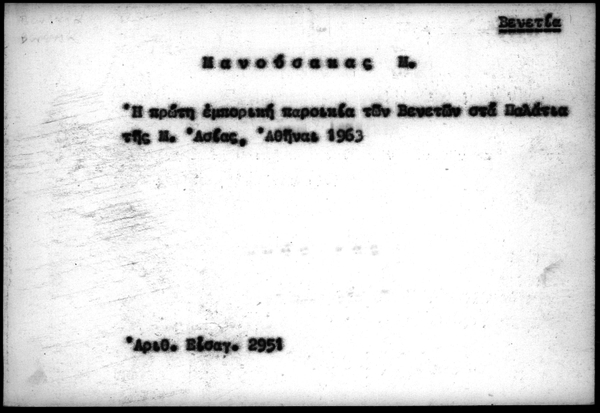 - Μανούσακας Μ., Η πρώτη εμπορική παροικία των Βενετών στα Παλάτια της Μ. Ασίας, Αθήναι 1963. Αριθ. Εισαγ. 2951