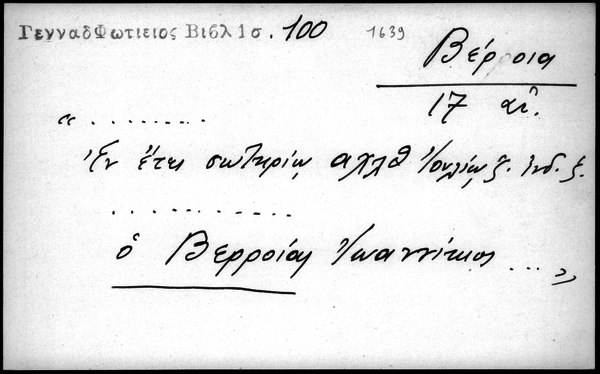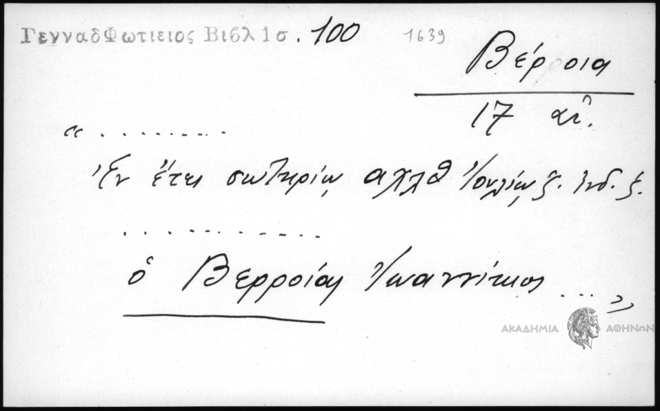 - "... Εν έτει σωτηρίω αχλθ΄ Ιουλίω ζ΄ινδ. ζ΄.... ο Βερροίας Ιωαννίκιος..."