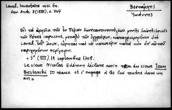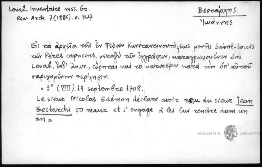 - Εις τα αρχεία της εν Πέραν Κωνσταντινουπόλεως μονής Saint-Louis των Peres capucins, μεταξύ των εγγράφων, καταγραφομένων υπό Leval, ένθ. ανωτ. εύρηται και το κατωτέρω κατά την υπ΄αυτού παρεχομένην περίληψιν: "3o (VIII) 19 septembre 1708. Le sieur Nicolas Edemon declare avoir recu du sieur Jean Bestarchi 50 reaux et s΄ engage a les lui rendre dans un an".