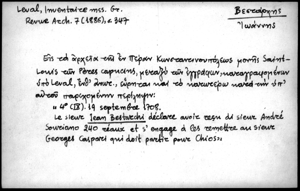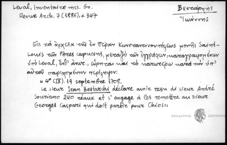 - Εις τα αρχεία της εν Πέραν Κωνσταντινουπόλεως μονής Saint-Louis των Peres capucins, μεταξύ των εγγράφων, καταγραφομένων υπό Leval, ένθ. ανωτ. εύρηται και το κατωτέρω κατά την υπ΄αυτού παρεχομένην περίληψιν: "4o (IX) 19 septembre 1708. Le sieur Jean Bestarchi declare avoir recu du sieur Andre Sovriano 240 reaux et s΄ engage a les remettre au sieur Georges Caspari qui doit partir pour Chios".