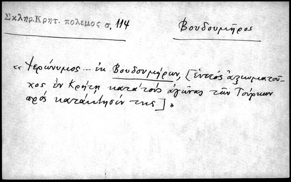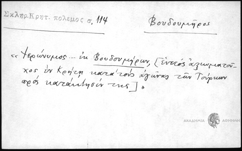 - "Ιερώνυμος ... εκ Βουδουμήρων, [ενετός αξιωματούχος εν Κρήτη κατά τους αγώνας των Τούρκων προς κατάκτησίν της]"