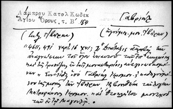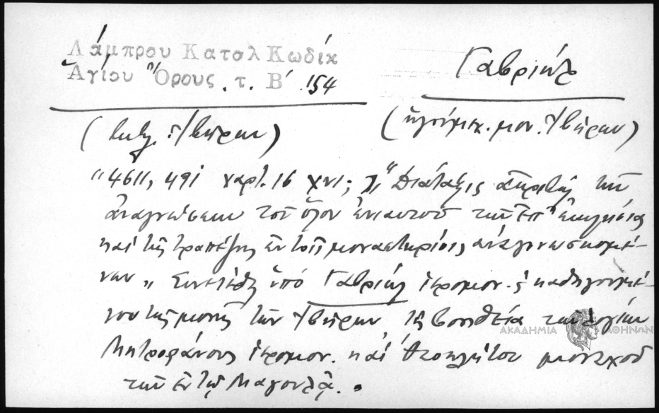 - "4611, 491 χαρτ. 16 XVI;" "Διάταξις ακριβής των αναγνώσεων του όλου ενιαυτού των επ΄εκκλησίας και της τραπέζης εν τοις μοναστηρίοις αναγινωσκομένων" Συνετέθη Γαβριήλ ιερομον. και καθηγουμένου της μονής των Ιβήρων τη βοηθεία των λογίων Μητροφάνους ιερομον. και Θεοκλήτου μοναχού των εν τω Μαγουλά.