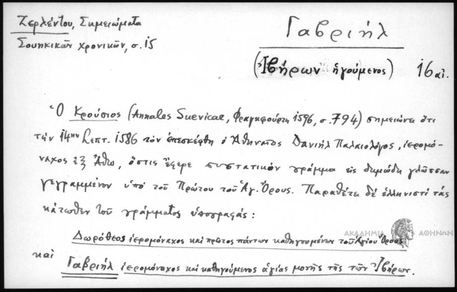 - Ο Κρούσιος ( Annales Suevicae, Φραγκφούρτης 1596, σ. 794) σημειώνει ότι την 14ην Σεπτ. 1586 τον επεσκέφθη ο Αθηναίος Δανιήλ Παλαιολόγος, ιερομόναχος εξ Άθω, όστις έφερε συστατικόν γράμμα εις δημώδη γλώσσαν γεγραμμένον υπό του πρώτου του Αγ. Όρους. Παραθέτει δε ελληνιστί τας κάτωθεν του γράμματος υπογραφάς: Δωρόθεος ιερομόναχος και πρώτος πάντων καθηγουμένων υου Αγίου Όρους και Γαβριήλ ιερομόναχος και καθηγούμενος αγίας μονής της των Ιβήρων.