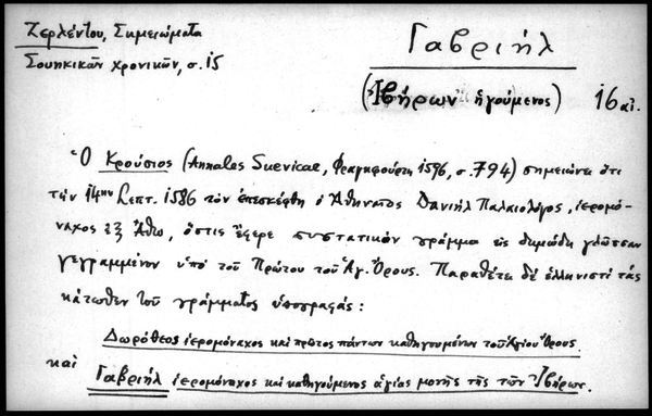 Γεγονός: Υπογραφή του ιερομονάχου και καθηγούμενου της μονής Ιβήρων Φαβριήλ σε συστατική επιστολή, που παρέδωσε ο Αθηναίος Δανιήλ Παλαιολόγος κατά την επίσκεψή του στον Μαρτίνο Κρούσιο.