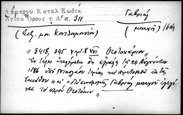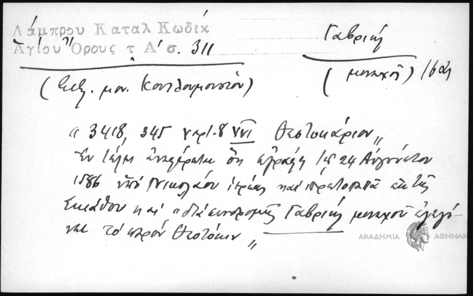 - "3418, 345 χαρτ. 8 XVI Θεοτοκάριον" Εν τέλει αναφέρεται ότι εγράφη τη 24 Αυγούστου 1586 υπό Νικολάου ιερέως και πρωτοπαπά εκ της Σκιάθου και "δια συνδρομής Γαβριήλ μοναχού εγεγόνει το παρόν θεοτόκιν".