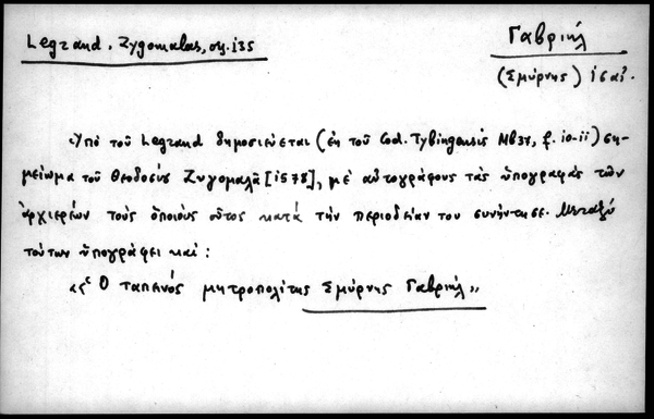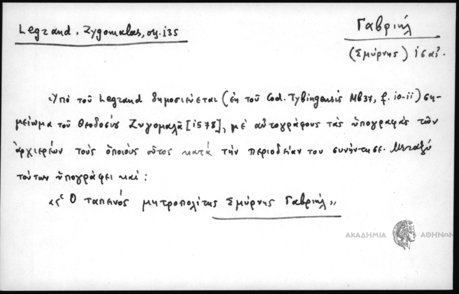 - Υπό του Legrand δημοσιεύεται (εκ του Cod. Tybingensis Mb37, f. 10-11) σημείωμα του Θεοδοσίου Ζυγομαλά [1578], με αυτογράφους τας υπογραφάς των αρχιερέων τους οποίους ούτος κατά την περιοδείαν του συνήντησε. Μεταξύ τούτων υπογράφει και: "Ο ταπεινός μητροπολίτης Σμύρνης Γαβριήλ"