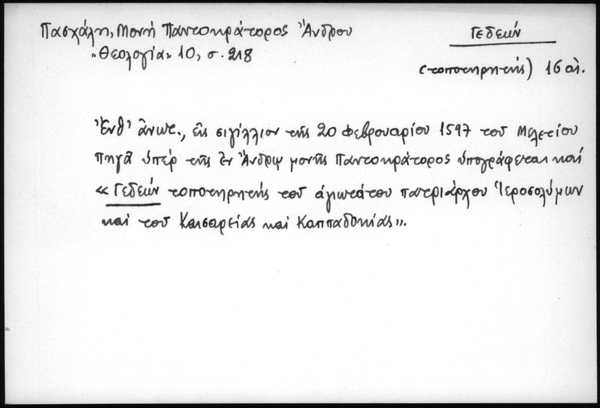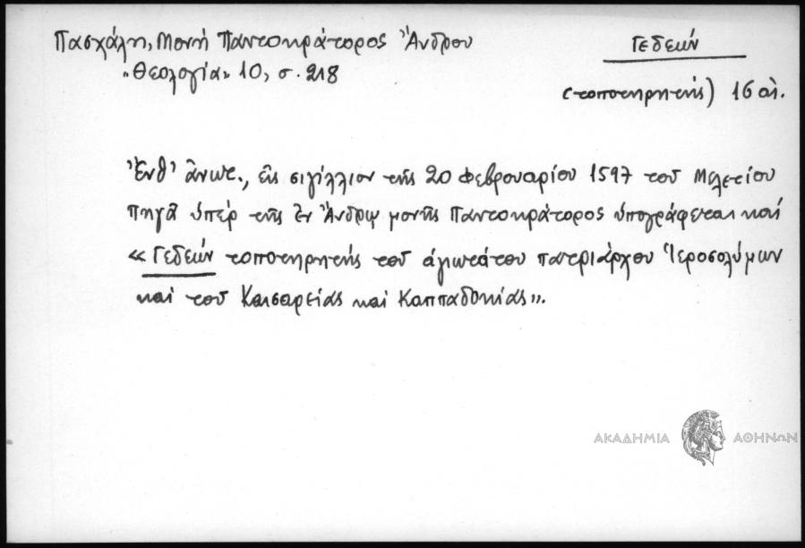 - Ένθ΄ ανωτ., εις σιγίλλιον της 20 Φεβρουαρίου 1597 του Μελετίου Πηγά υπέρ της εν Άνδρω μονής Παντοκράτορος υπογράφεται και "Γεδεών τοποτηρητής του αγιωτάτου πατριάρχου Ιεροσολύμων και του Καισαρείας και Καππαδοκίας"