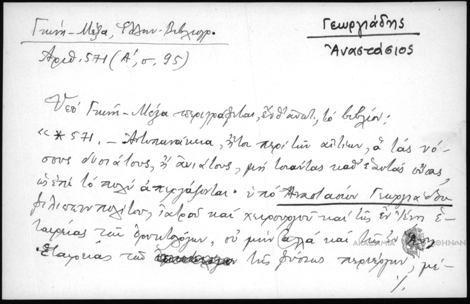 - Υπό Γκίνη - Μέξα περιγράφεται, ένθ΄ ανωτ., το βιβλίον: "* 571 - Αντιπανάκεια, ήτοι περί των αιτίων, α τας νόσους δυσιάτους, ή ανιάτους, μη τοιαύτας καθ΄ εαυτάς [ώας], ως επί το πολύ απεργάζονται, υπό Αναστασίου Γεωργιάδου Φιλιππουπολίτου, ιατρού και χειρουργού και της εν Ιένη Εταιρείας των Ορυκτολόγων, ου μην αλλά και της εν Άλη Εταιρείας των της φύσεως περιέργων, μέλους αντεπιστέλλοντος, υφ΄ ου και εις την Λατινάδα Φωνήν μεθηρμήνευται. Εν Βιέννη, αωι΄. Τύποις Σχραιμβλίου, παρά Φιλίππω Ιωσήφ Σχαλβάχερ".
