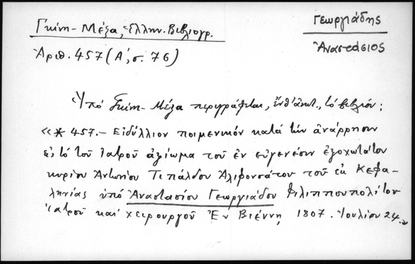 - Υπό Γκίνη - Μέξα περιγράφεται, ένθ΄ ανωτ., το βιβλίον: "* 457 - Ειδύλλιον ποιμενικόν κατά την ανάρρησιν εις το του ιατρού αξίωμα του εν ευγενέσιν εξοχωτάτου κυρίου Αντωνίου Τιπάλδου Αλιφονσάτου του εκ Κεφαληνίας υπό Αναστασίου Γεωργιάδου Φιλιππουπολίτου ιατρού και χειρουργού. Εν Βιέννη 1807, Ιουλίου 24"