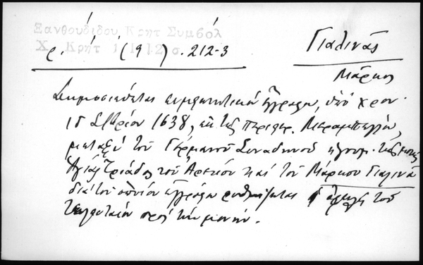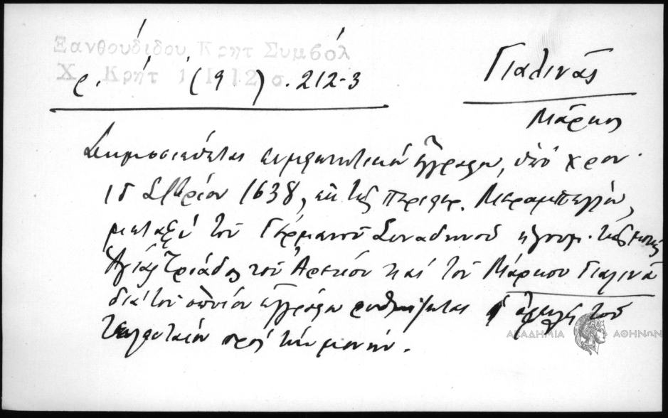 - Δημοσιεύεται συμφωνητικόν έγγραφον, υπό χρον. 15 Σ/βρίου 1638, εκ της περιφερ. Μεραμπέλλου, μεταξύ του Γερμανού Συναδηνού ηγουμ. της μονής Αγίας Τριάδος του Αρετίου και του Μάρκου Γιαλινά δια του οποίου εγγράφου ρυθμίζεται οφειλή του τελευταίου προς την μονήν.